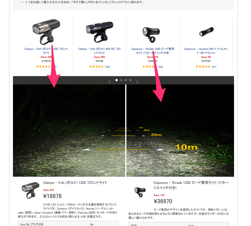 このようにライトをドラッグして実際の見え方の比較ができます。(多分Wiggleがわで同じ条件での照射写真をとっている)